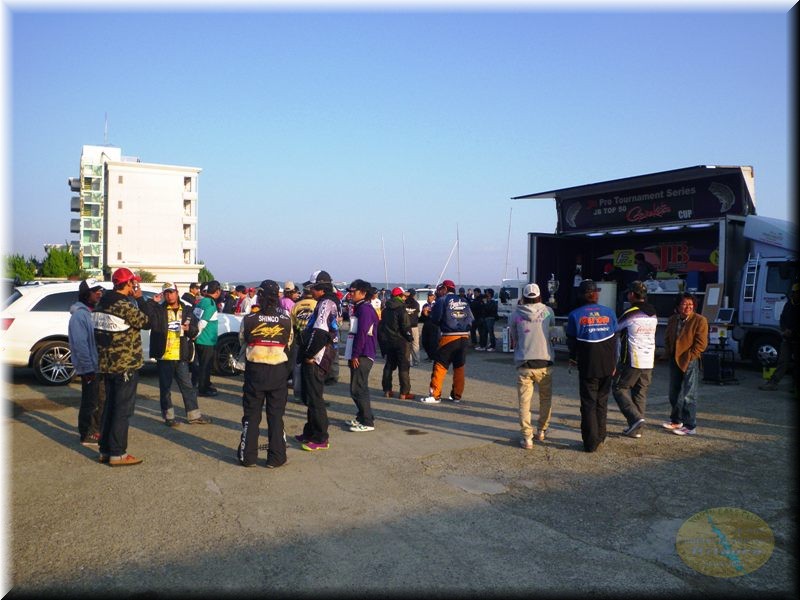 夜中から3日間の準備をして潮来マリーナへ。東関道を夜中走って来ると天候は雨。「おいおい雨はいかんよー」と思いながらまだ暗い5時過ぎに潮来マリーナ着。この頃から既に選手たちがボートを引いて会場入り。そして暫くしてからスロープへ行ってみると早くも準備してる選手も多いです。幸い雨はやんでるんですが、風が強め。聞く話だと前日の夜中には大雨が降ったらしいですが、さーどんな大会になるやら。6時過ぎに私を含め、会長、大竹君も集まってお手伝い開始。会長が3日間のスロープ使用料の受付などなど。そしてオブザーバーとして同船する方も集まり出してますが、見た顔が集まってますわ。本当なら私もオブザーバーでこの北浦でトップのプロの釣りを見てみたいもんなんですが…スタッフなんでぐっと堪えて…「えーなー」で指をくわえて見てるだけ。