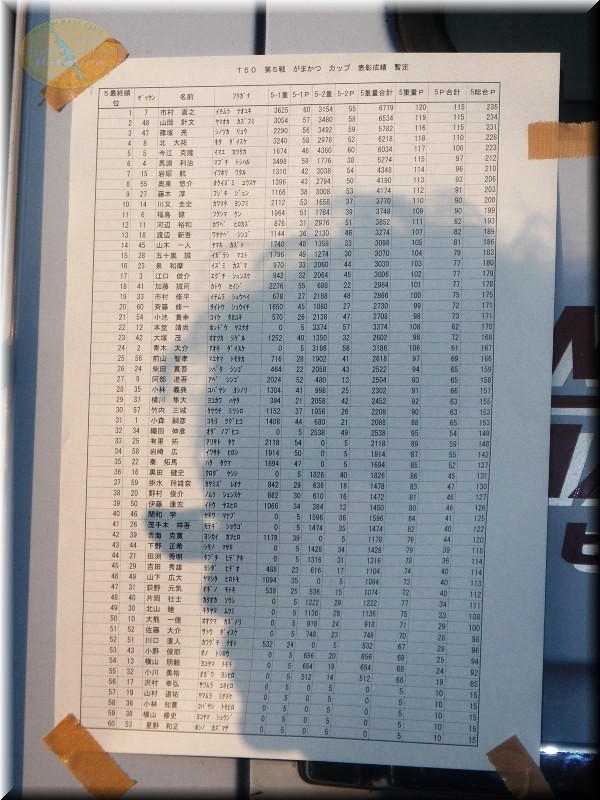 3位に昨日は4位だった山岡プロが5本揃えて3,480gすげー