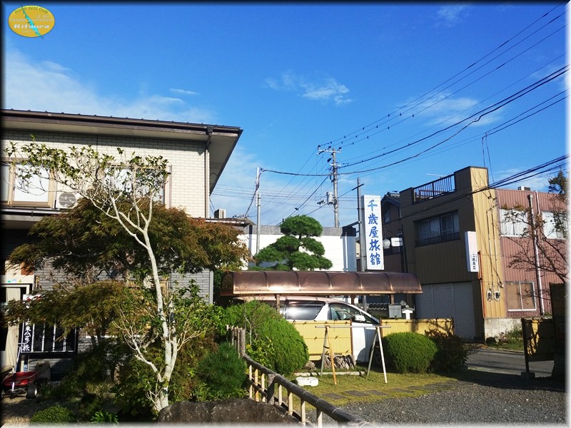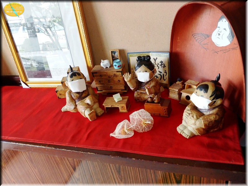 そして私と倉本副会長の地元じゃない組は今夜はすぐそばのお宿の「千歳屋旅館」に宿泊。玄関前の置物さんもマスクしてお迎えしてました。