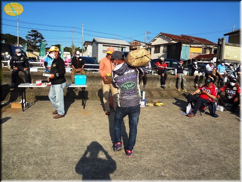 私がデータ入力をサクッとやって表彰式です!相変わらずに雨が降ってるので屋根のある場所をお借りして表彰式と大抽選会です。今回は潮来マリーナ様よりお米の協賛も頂いております!ありがとうございます!