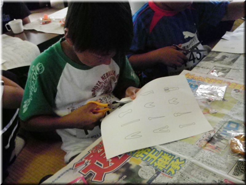 そして子供たちとゴミ拾いをしながら公民館?まで移動です。今年もポークシートを子供が切ってそれで釣りをするってスケジュール。しかしこの日もかなり暑い1日でした。寝不足の私はもーこの時点でかなりヘロヘロ…子供たちに型紙を配ってポークシートをカット。真剣になって切る子もいれば、あっさりカットして後はお菓子をほおばる子といろいろですがそろぞろ皆楽しんでカットしてました。もちろん宮崎副会長も子供に交じって…