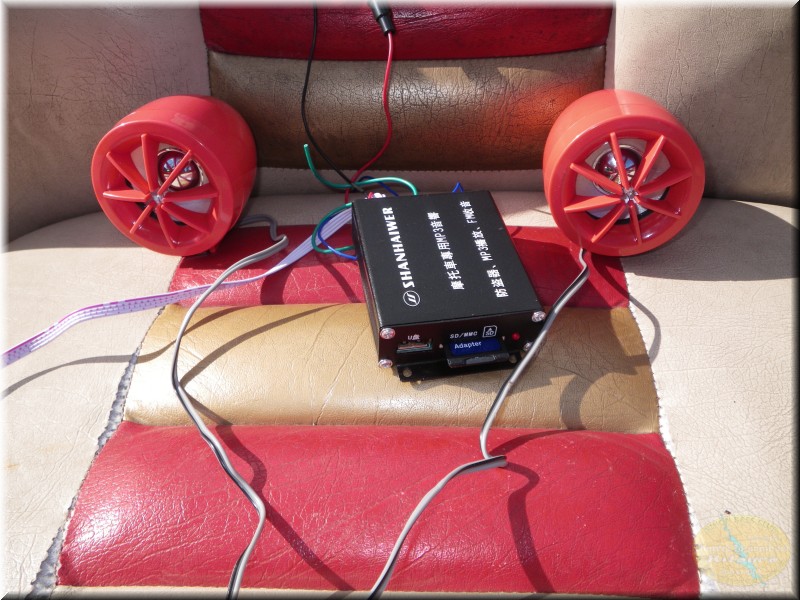 そしてこの日の午前中はボートにmp3プレイヤー&防水のスピーカーを設置も。これはバイク用のやつですがminiSD&USBで音楽再生可能です。それとFMとセキュリーティー機能も付いてるセキュリーティー機能は警告音が鳴りだす。やったらうるさいよー的な…。ちゃんと聞くに問題ない音で。これでボート上で走行中に音楽掛けながらクルージングしちゃう事がOK。んー4stエンジンのなせる技?しかし本当にクルージング状態なら音楽楽しめますが本気走りしちゃうと風切り音や水切り音でちょっと厳しいかな?スピーカーの位置にもよるか、(mp3より先につけるもんあるでしょーって突っ込みありそうでそうですが)
