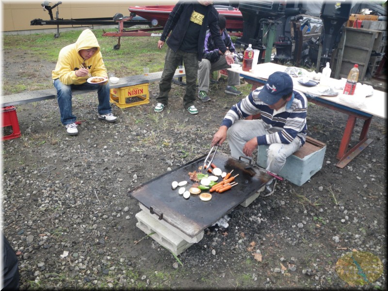 そして表彰式の後はお楽しみのバーベーQです。皆さんこの為にお昼も食べずに釣りしてますから、凄い勢いで出来あがるそばからお肉やフランクフルト、焼きそばが無くなって行く、まーそれでも十分な量がありますが。私もお肉が焼き上がるまでおにぎり食べて繋いで出来上がりの合図でたんまり頂いた。それに今回出てたジャーマンポテトが美味しかった。もービール飲みたくなっちゃいましたが、皆さんの手前ガマンしましたが。そして第1段の焼きそばの出来上がりでぬかった!気付いたら既に無かった。第2弾の出来上がりまでまって焼きそばもたんまり頂きました。