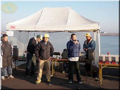 皆さんが一通りお腹満たして温まったら表彰式です。優勝は…鈴木達児プロ!北浦の山田ワンド、蔵川ワンド、矢幡ワンドの3ワンド攻めで3本で3220gのブッチ切りですわ。お見事。来年の北浦チャプターが楽しみですな~。そしてインタビューをしているのは桂川いたるプロ。遠賀川で見事な釣りを展開してました。遠賀川から常陸利根へ「景色がまったく変わらんよ」って言ってましたが。大竹ちゃんはブービー賞で「ギヤオイル無料交換券」ゲット!それを私がゲット!。いやいや心の大きい大竹選手にいただきました。「あざーっす!」。ちなみにビックワンは流入河川を登り切ってビックバドを投げ切った斎藤さんが1570gのビックバス。素晴らしい。ちなみに1位~3位までには盾、5位までは金券が…いいーなぁ~。ちゅーか釣りたいな~。詳細は「横利根川で暮らす人」で。