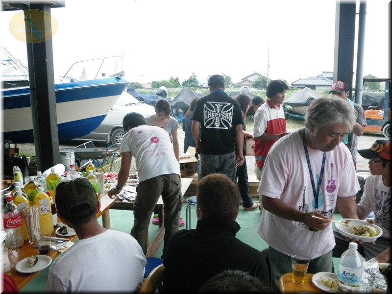 表彰式まではバーベQタイムです。時折雨が降る肌寒い中ですコージ君奥さん特製のマジ旨のトン汁で温まり、お肉やシーセージ、混ぜご飯のおにぎり等で参加者達と和気あいあいで楽しいひと時。