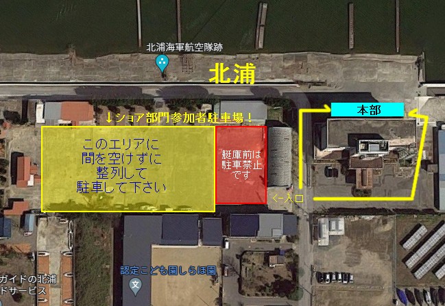 駐車場入口先の艇庫前(写真の赤エリア)を駐車禁止とします。ショア部門参加者の車はその先のエリア(黄色いエリア)に手前から間を開けずに整列して駐車して下さい。