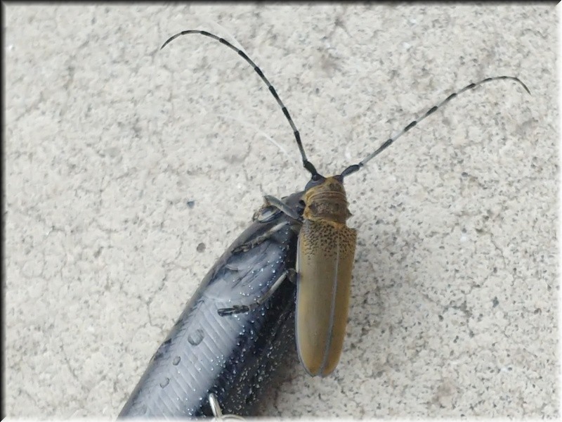 私はトップに出ないかな~と(これだけ晴れて風もないんじゃ無理か)サミーを頑張って投げてたが反応なし!そして水面に何か動いてる物が…そのそばにサミーを持っていったらすかさずサミーにしがみついてきた!上げてみたらカミキリムシでした!
