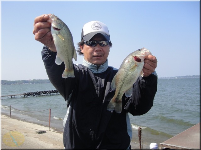 そうそう今回、私大塚もショア部門の開催中に新しくベイトブレスからでたフィッシュテールを使って釣りしてみました。最初は違うワームで桟橋を打ってたんですが全く反応なし。でフィッシュテールの「6月はやっぱジュンバグカラーやー」で、1投目でそこそこのバスが釣れました。これが今年北浦の初バス。少しうれしかったりして。(写真はブスッとしてますが…)今回フィッシュテールをもらった人は使ってみて下さい。釣れますよこれ。終わってから横利根でも2本釣れたしね。