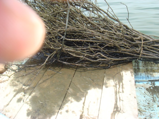 沈めてあるソダを引き上げ大きな網にソダを入れて上下に振りエビを取る