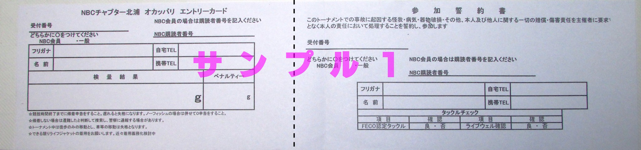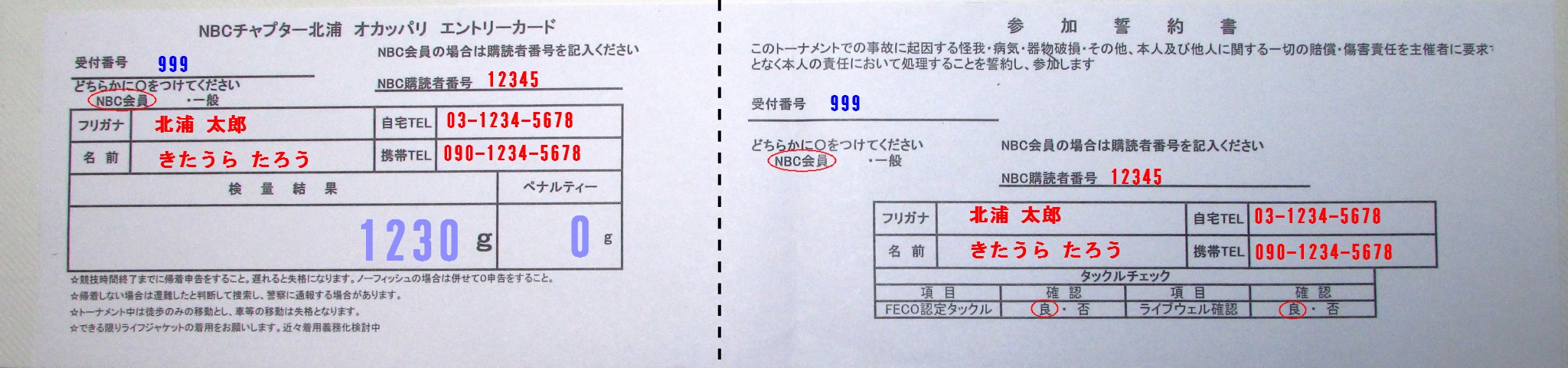 ・受付時にエントリーカードを受付に提出すると、誓約書は開催者側で受け取り、参加選手側にはaのエントリーカードと受付番号のNBCチャプター北浦ショア部門参加者用カードをお渡しします。このNBCチャプター北浦ショア部門参加者用カードは試合中は必ず見える場所に付けておく事、このNBCチャプター北浦ショア部門参加者用カードは必ず帰着時に返却する事。