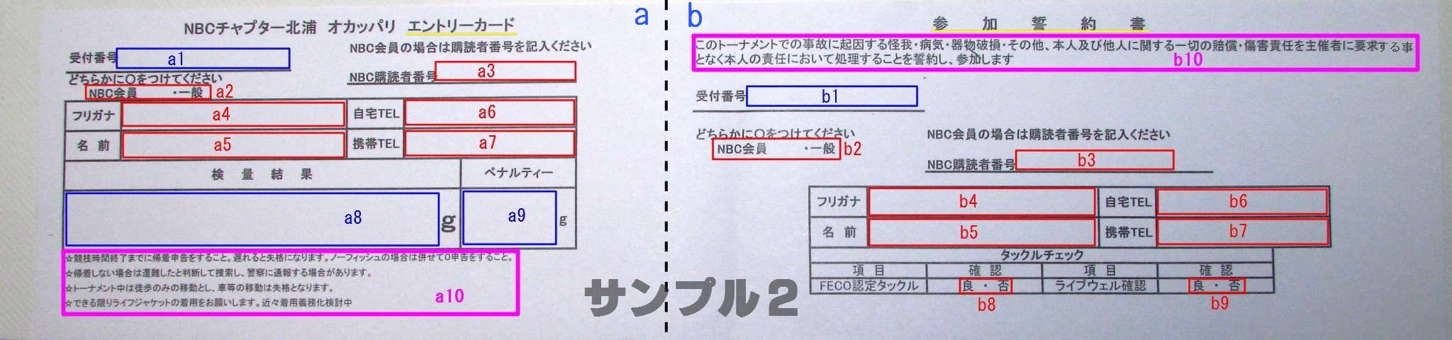 ・a3,b3>NBC会員の方は、NBCから発行された購読者番号を記入。一般での参加者は空白。NBC会員の方はa3,b3 同じ番号を記入。受付時にバスマガジン購読者証を必ず提示する事。提示なしの場合は一般の扱いになりますので注意して下さい。