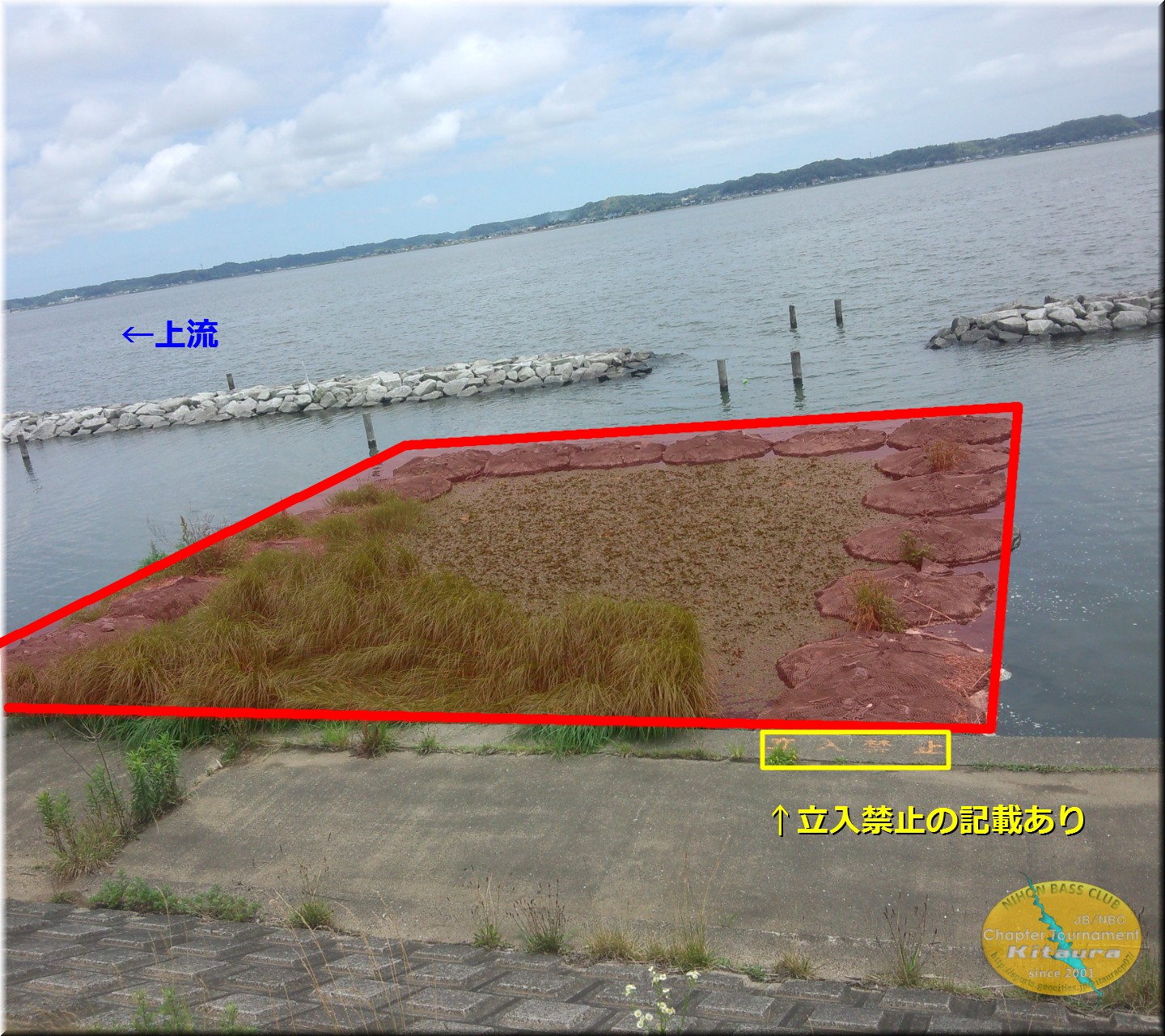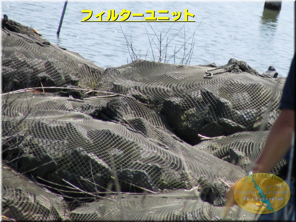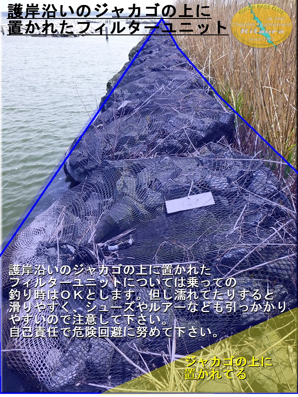 フィルターユニットとは:通称でタマネギやキンチャクとも呼ばれる物で、砕石をネットで包んだものを指す。NBCチャプター北浦ショア部門トーナメントエリア上流側の石積みエリアにフィルターユニットで四角く囲んだものが数多く設置されています。このフィルターユニットで四角く囲んだ場所は立入禁止、及び釣り禁止となっています。場所によっては設置されてる護岸沿いに黄色い文字で立入禁止と書かれいますが、書かれていなくてもフィルターユニットに囲まれた場所については立入禁止ですので、フィルターユニットに乗る事も禁止となります。