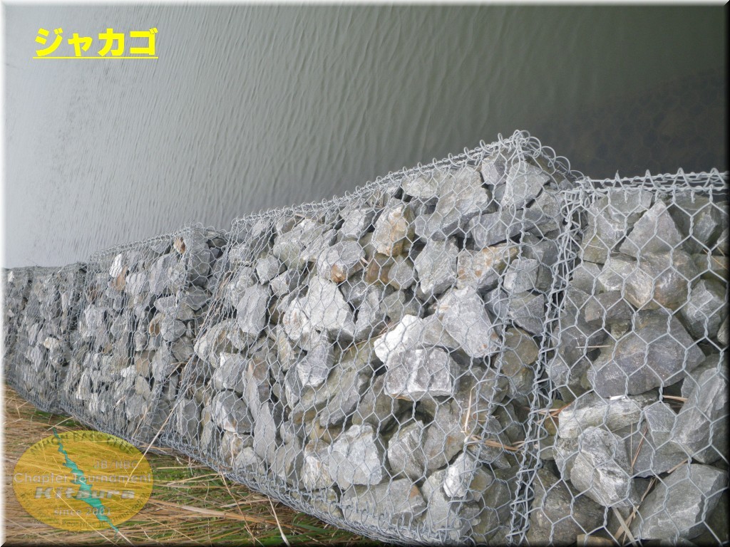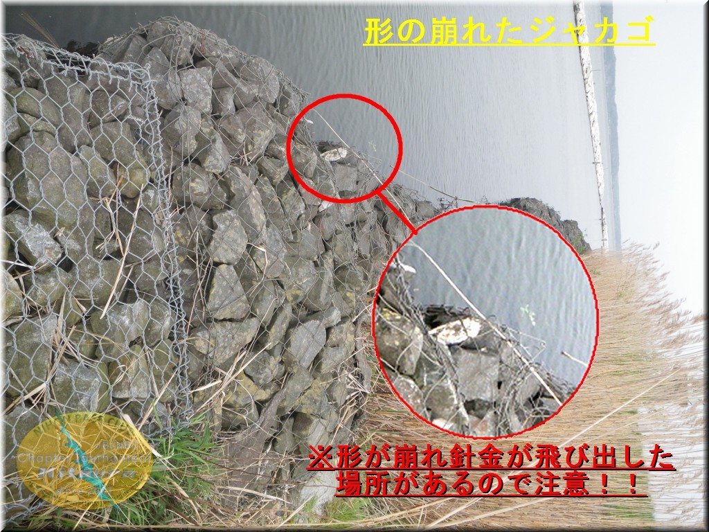 またジャカゴは濡れていたりすると大変滑りやすくなったり、形の崩れたジャカゴは乗った時に中の砕石がずれたりする場合もあるので十分に気を付ける事。ジャカゴに乗って釣りをされる方は出来るだけライフジャケットの着用を推奨する。