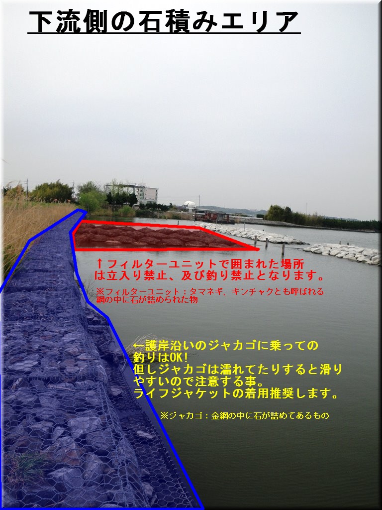 尚、場所によってはフィルターユニットに囲まれた場所が水没していたり、増水すると水没してしまう場所もありますが、水没しているものでも立入禁止、及び釣り禁止ですので、注意する事!