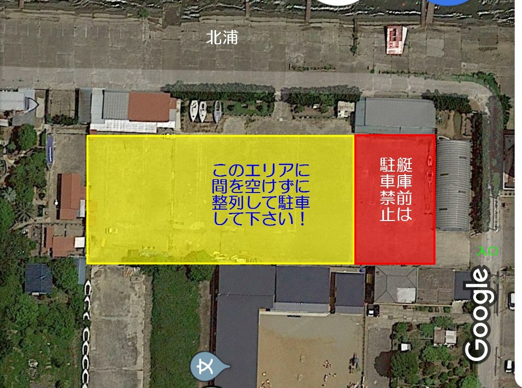 駐車場内で入口直ぐの艇庫前のエリア(写真の赤の部分)は駐車禁止とします。このエリアには絶対に駐車しないで下さい。その奥の部分(黄色のエリア)に手前から間を開けずに整列して駐車して下さい。詳細は下記の写真を参照して下さい。