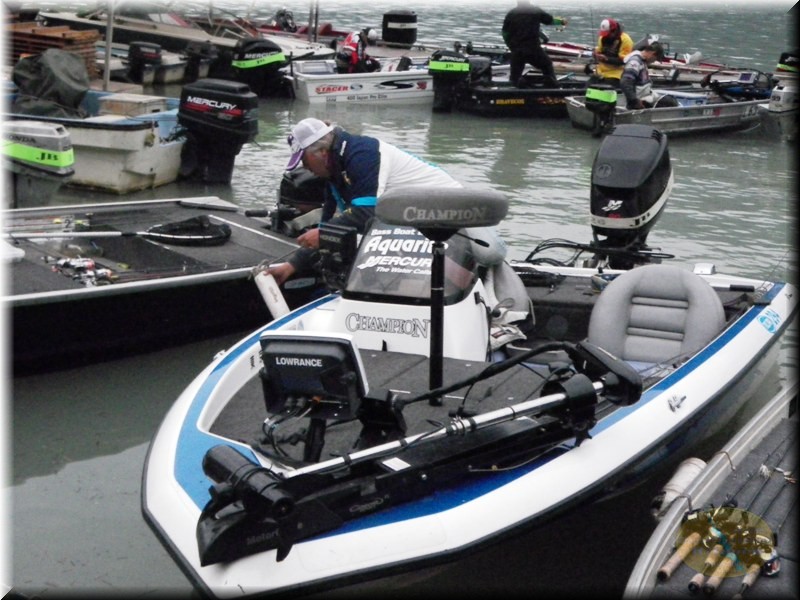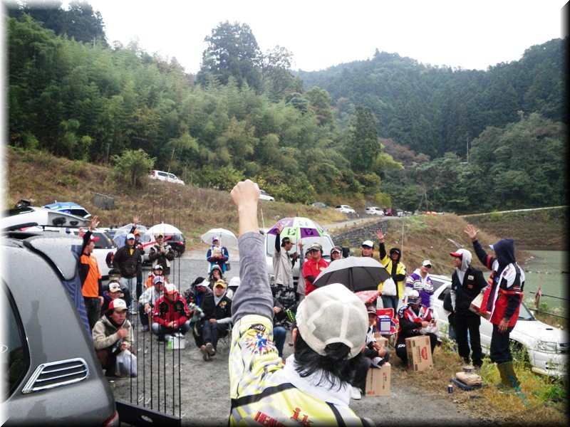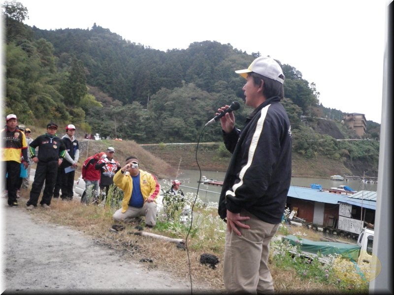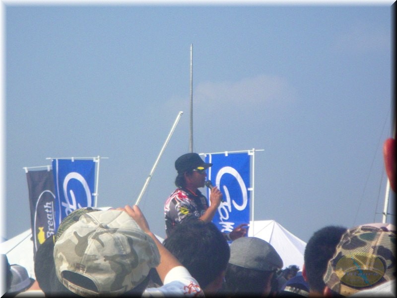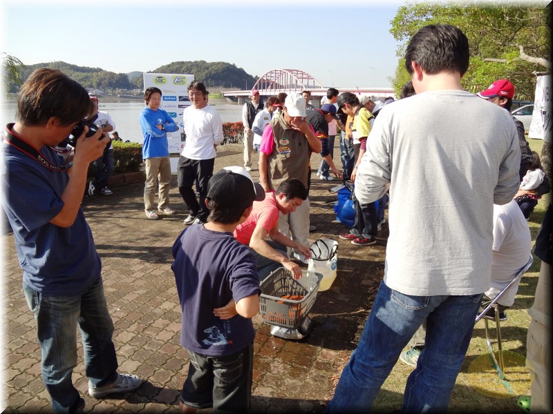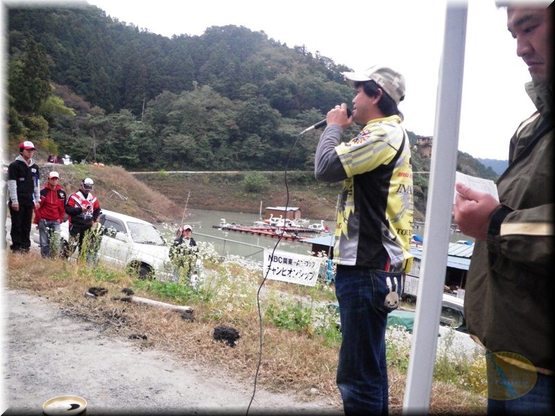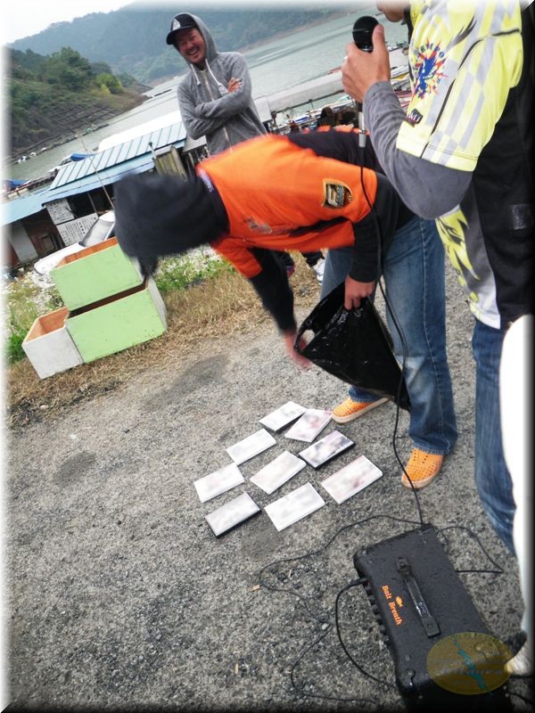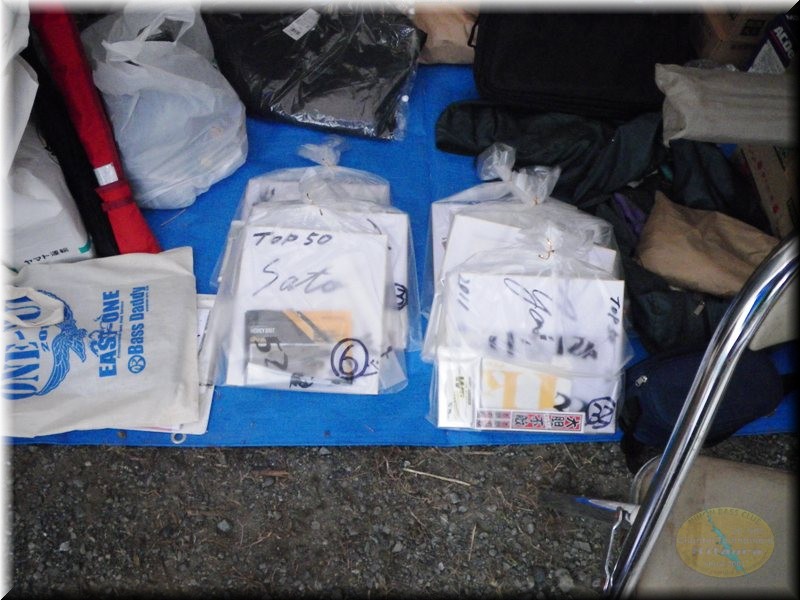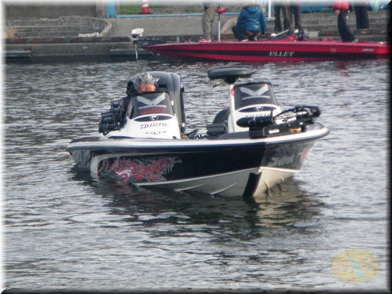 そんな事をしてるうちにお昼を食べたらもー帰着の準備、決勝の帰着は13時。私と大竹君で帰着時の受付を。桟橋の先に立って帰着選手のスタートナンバーの記載されたフロートを長ーい柄の付いたネットで回収するだけですが、おまけに実際にネットをもって回収作業をしたのは大竹君だし…実際これって長いネット自体も重いしそれに選手のフロートを入れて行って貰って帰着完了なんですが、フロートとは言え30個もネットに入ると更に重くなるから大変なんですが、そこは大竹くん、既に何度か経験済なんでさらっとやってますわ。全員の帰着完了で実際にフロートの数も30個あるのを確認して本部へ全員帰着完了の報告。その後やっぱりボートを上げるためスロープに来るトレーラの交通整理。実際この時には結構なギャラリーがスロープ前に居るんで大変ですわ。小さい子供もいたりするし。でも今回は昨日に続いてお手伝いに来てくれた小野さん、大川さん、そしてBoats Service OHKAWAの大川さんも手伝ってくれたりで問題なく終了。そしてこれからが注目のトレーラウエイン、そして順位の発表、そして年間の発表がありますわ。このトレーラウエインも結構大変。本部のトラック前でボートでウエインをギャラリーに見てもらって終わったらそのギャラリーの間を通過するんですが真っすぐならまだしも直ぐに90度曲がって裏へ行くから、曲がる場所でにギャラリーの整理もしないと。車とトレーラーで結構な内輪差が出るのを知らない氏と藻多いし、見るのに夢中になっちゃうからね。まートレーラーウエインがトップ50の見せ場だちゃー見せ場だしな。しかし2本しか持って来れなかった馬渕選手は「なんで俺がトレーラーウエインなんですか!」って言ってましたが。そして暫定トップの市村選手のトレーラーウエイン、ライブウエルからはデカくは無いですが3本で1500gのウエイン、んー微妙なウエイト。そして2日目にブッチでトップウエイトを持ってきた今江選手。さすがの人気ですわ。今江選手がボートに乗って現れると一気に後ろからも人が写真撮りに押し寄せて来るし。そしてウエインは…お見事5本のリミット揃えて来たよ。サイズはアベレージって感じでしたが最後の1本は良いサイズ。こりゃー優勝があるかも知れないと期待させるウエイトの3,755gです。いやーお見事。結局3日目も今江プロがトップウエイトですわ。これで昨年の2日目トップで3日目にノーフィッシュをやってしまったリベンジを見事に達成ですな。3日目の釣果的にはまーまーって感じなのかな~、いやーこのトップの選手でこれなんだから厳しかったのかも。リミット達成は2名だもんな、ノーフィッシュも2名だし、持ってきた選手の半分が1本のウエインかーやっぱ風も出たりで厳しかったねー。天候が3日間違ってたしで読みが難しいかったのもあるし、水位の変化もあったりの大会になったのも有りますか。3日目の結果