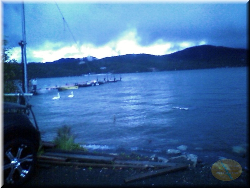 当日エレキ&バッテリーや何やらたっぷりの荷物を車にのせ夜中の3時に出発。しかし中央道の相模湖辺りからもー大雨だし!そして大雨の中かなりスローなペースで5時過ぎにやっと山中湖に着いたが山中湖も雨、そして強風が吹き荒れてる!「勘弁してよ~この雨風の中でボートセッテイングするのかい!」既にテンションがた落ち。おまけに台風や大雨の影響でまだ山中湖は大増水中だし。強風や波により桟橋もガンガン揺れるは桟橋付けのボートも激しく揺れる中で、ビクビク恐る恐るセッテイングして、終わった頃には既に「もー疲れた!」って感じ!やっぱりレンタル戦は前準備だけでヘロヘロになるなー。