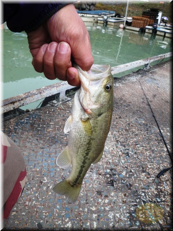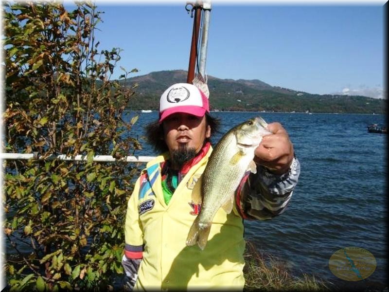 この深場を藻を探しながらライトテキサスで、しかし風が強すぎですわ…釣りにならん!おまけに深場の藻はかなり薄いし…まー10月だもんな~それでも1時間ほどやって見たがノー感じ。たまーにいい感じでベイトは映るんだがこりゃーだめ!そして国道側にかなりの冠水ブッシュがあったんでそっちへ!ここでは1/4の5.5インチのセクシーアンクルのネコパンチでブッシュの中へガンガン入れ行く感じで撃ちまくったんですが…だめー「やっぱ今の山中湖はキビシ過ぎるんだわ~わしには無理か?」そしてブッシュの際をフィッシュテールのライトテキサスで。するとまるでカスミのアタリ見たいな「モゾモゾ」的なバイト?これはもー下野先生の教え通り「おかしい思ったら全部合わせなアカンよ!それで釣れたらそれがその日のバイトのパターンなんやらー」との教え通りに合わせたら乗りました。バス君です。でも小さい…ネットを取ろうとしたがリールに絡んでるし「なんで絡んでるん!」これがまた「何時の間に何がどうしてこうなるんや!」って位、ベイトリールのハンドルとスピニングのハンドルが絡んでやんの!「あーめんどくせ!」でネット使わず抜いちゃいました。「ポロッ」て落ちたらどうすんだよって直ぐに「反省!釣り始まる前にネットは直ぐ使えるように準備しておきましょう」小さいがキーパーですわ。「400g無いかな?」でも貴重な1本。