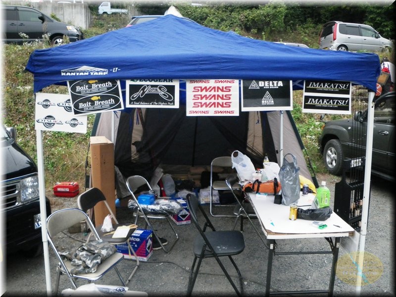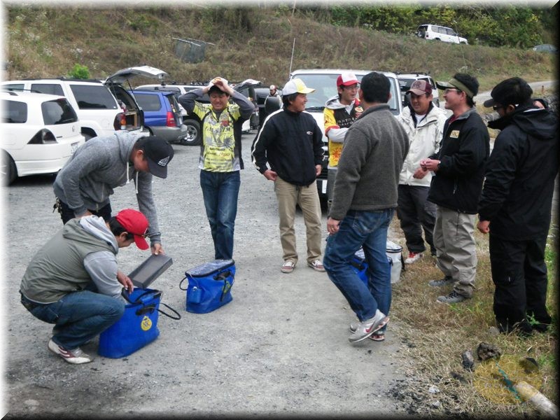 そしてミーティング。第1戦はエバーグリーンカップなんでいつもの如くサル番長こと関和プロの挨拶があってから星野プロルール委員長からの説明。ここで発表されたのが本日の爆風予想による試合時間の短縮。2時間短縮で帰着が11時に。8時にスタートとして3時間。移動なんか入れたら実質釣りできるのは2時間強ですわ。ここでまた迷いまくりです。風が出始るまで大山勝負で考えてたんですが…どないしよー