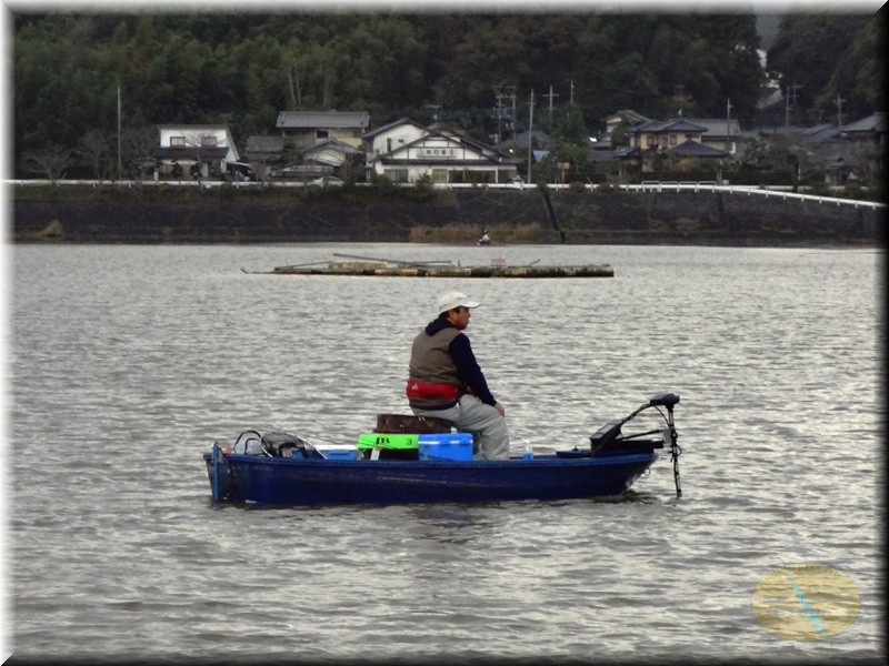 その後はノー感じで10時になり、ネイティブ狙いで場所移動。エンジンで沖に進んでアイドリングにした途端エンジンが「プスプスプス」で止まっちゃいまして、ここから泣きの1時間、沖あいで手に豆を作りながらも色々試しながらスターターのロープを永遠と30分引きまくるもエンジン掛からず…既にマメは痛いし、それよりスターターのロープを引く力が尽き果てたって感じ。「あぁー折角1本釣ったのにー」此処からエレキで会場前まで…「無理か」で結局ボート屋に連絡して来てもらう事に。沖で漂流しながら15mをラバージグで撃ってるとレスキューの和船が来たんですが、乗ってるのは事務局長の豊吉氏?そして和船に寄せて事務局長の豊田氏にガンガンロープを引いて貰ってたら「掛かりやがんの!あんだけやって掛かんなかったのにさー」でもやっぱアイドリング中に止まっちゃうんで、暫く吹かしながらで…安定はしないがどうにかなりそうって感じで「釣りは続けて構わない」って事でどうにか1時間後に再開。しかしエンジンの不安がある為行きたかった場所へ行くのは断念!会場から一番遠い方だし。掛かんなかったら怖いんで会場近くへ戻る事に。