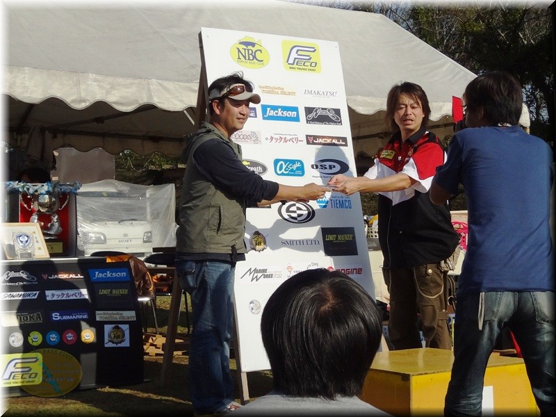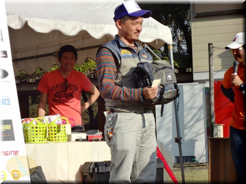 そしていきなり本部から北浦チャプター金子会長を舞台の上に促すアナウンスが…「ん?何事、締めの挨拶するんかい」なんて思ってた見てたらあらびっくり!今江選手も上がってて、何と今年今江プロが公言してた獲得賞金を全て寄付するって事で、今回2位になって獲得した賞金を北浦チャプターへ「復興の為に」と寄付してくれたんですよ。その為に舞台の上で今江選手…いや今江大先生から金子会長へ手渡されてるし!「すげー!」まー実際賞金を寄付するのは他の試合の映像等で見てたりで「いやー大したもんだ!」とは思ってましたが実際に見て当事者になって見ると(当事者でもないか)こりゃーマジで尊敬しちゃいますな。確実に私の数少ないRespect On My List入りですよ。そして金子会長も部隊の上で多