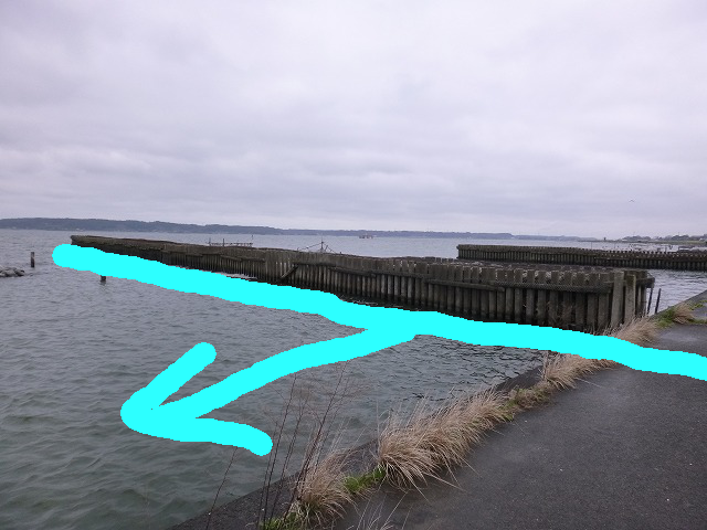 水門とドックを過ぎると皆さんご存知、立入禁止区域の白いポールが見えてきます。