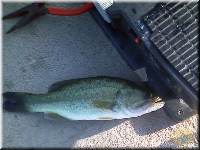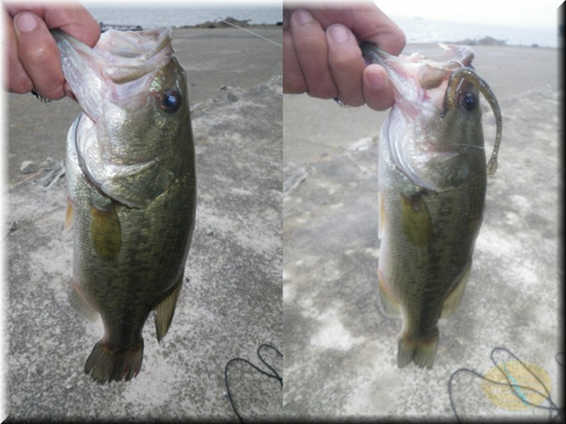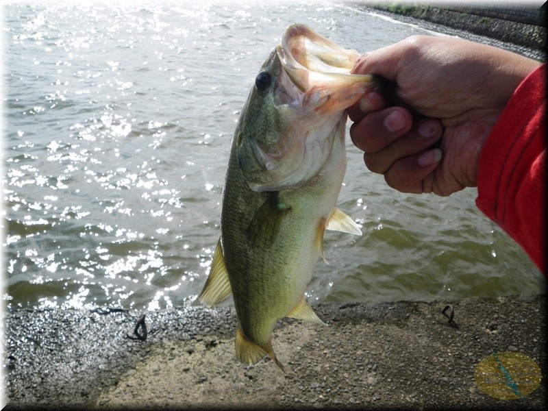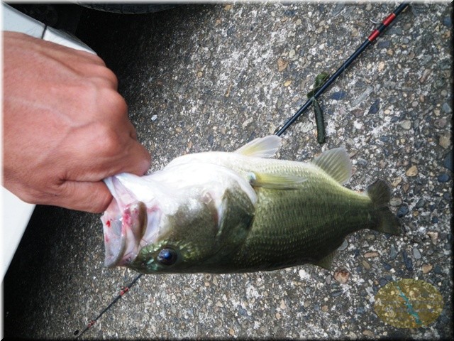 さすがに風が凄いからスピニングは無理だな、ベイトを出してみたんですが軽いシンカーが付いてたんで車を物色したら10gのフロリダシンカー発見!ワームもジャンボグラブ発見!チューことでジャンボグラブのフロリダリグで…何だか古めかしいリグですが、しかしスロープ脇へキャストし、フォールさせたらアタリははっきりしなかったんですが、しばらくしたら何だかムシャムシャしてないかいこれって?で思いっきり合わせたらやっぱ喰ってましたで上がって来たの35cm位のバス君です。ちょいと呑まれ気味でしたが無事にフックも外せてリリース。良かった釣れましたよあんな古めかしい仕掛けでしたが。