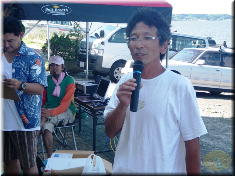 今回の冠スポンサーはジャッカルさん、なんで朝の冠スポンサー代表での挨拶は”らっきょ”事、岡田君にお願いしてだな…って岡田君がまだ来てないね~会長が電話しても繋がらず。ミーティング開始間際に電話したら、眠そうな声で「今日はキャンセルでお願いします」っておいおい…ジャッカルの冠の試合でキャンセルかい!困ったもんだ…ドンペリで飲んだくれてた様ですな~、そんなんで前回の試合で3位になった大川恵子選手もジャッカルサポートだって事で、急遽冠の挨拶をして頂きました、ありがとうございます。苦情はこの方に好きなだけ言って下さい。今回ショア部門は33名、ボート部門は20名の参加でボート部門は少し少ないく寂しいですが、今年は節電の影響等で日曜に仕事がシフトしてしまった業界等もあり参加できないくなってしまった方等もいるんで仕方ないのかな~とは思いますが。もっと参加してほしいもんです、頑張らんとねわしらも