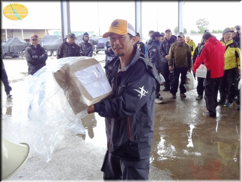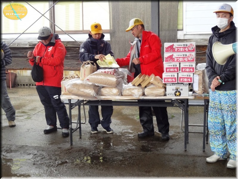 私がデータ入力をサクッとやって表彰式です!相変わらずに雨が降ってるので屋根のある場所をお借りして表彰式と大抽選会です。今回は潮来マリーナ様よりお米の協賛も頂いております!ありがとうございます!