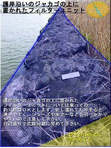 護岸沿いに平行に置かれているフィルターユニットについては乗っての釣りはOKとなります。但し、濡れていたりすると滑りやすかったり、乗った時に中の砕石がずれたり、シューズやルアーなども引っかかりやすいので注意して下さい。自己責任で危険回避に努めて下さい。